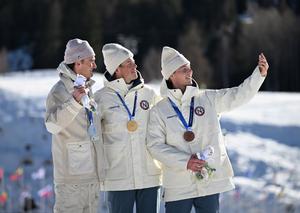 (260213) — TESERO, 13 febrero, 2026 (Xinhua) — El medallista de oro, Johannes Hoesflot Klaebo (c), de Noruega, el medallista de plata, Mathis Desloges (i), de Francia, y el medallista de bronce, Einar Hedegart, de Noruega, posan para fotografías durante la ceremonia de premiación de la salida masiva libre por intervalos de 10 km masculina de esquí de fondo en los Juegos Olímpicos de Invierno Milán-Cortina 2026, en Tesero, Italia, el 13 de febrero de 2026. (Xinhua/He Canling) (rtg) (ra) (vf)