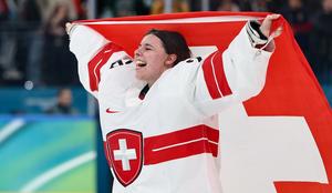 (260219) — MILAN, 19 febrero, 2026 (Xinhua) — La guardameta Andrea Braendli, de Suiza, festeja al término del partido por la medalla de bronce femenino de hockey sobre hielo entre Suiza y Suecia en los Juegos Olímpicos de Invierno Milán-Cortina 2026, en Milán, Italia, el 19 de febrero de 2026. (Xinhua/Wang Kaiyan) (da) (ra) (vf)
