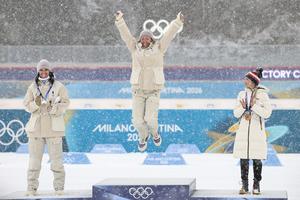 (260218) — LIVIGNO, 18 febrero, 2026 (Xinhua) — La medallista de oro, Xu Mengtao, de China, reacciona durante la ceremonia de premiación de aerials femenino de esquí acrobático en los Juegos Olímpicos de Invierno Milán-Cortina 2026, en Livigno, Italia, el 18 de febrero de 2026. (Xinhua/Zhang Hongxiang) (ah) (ra) (ce)